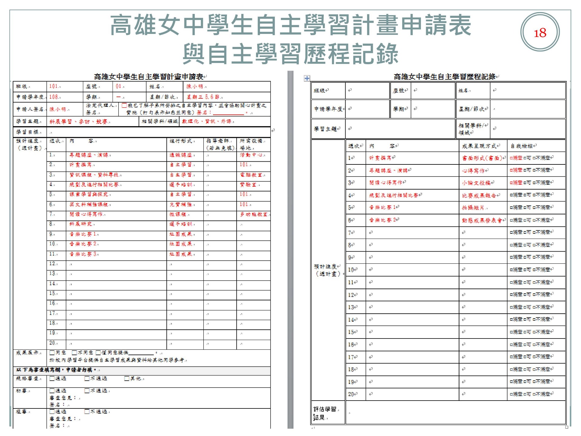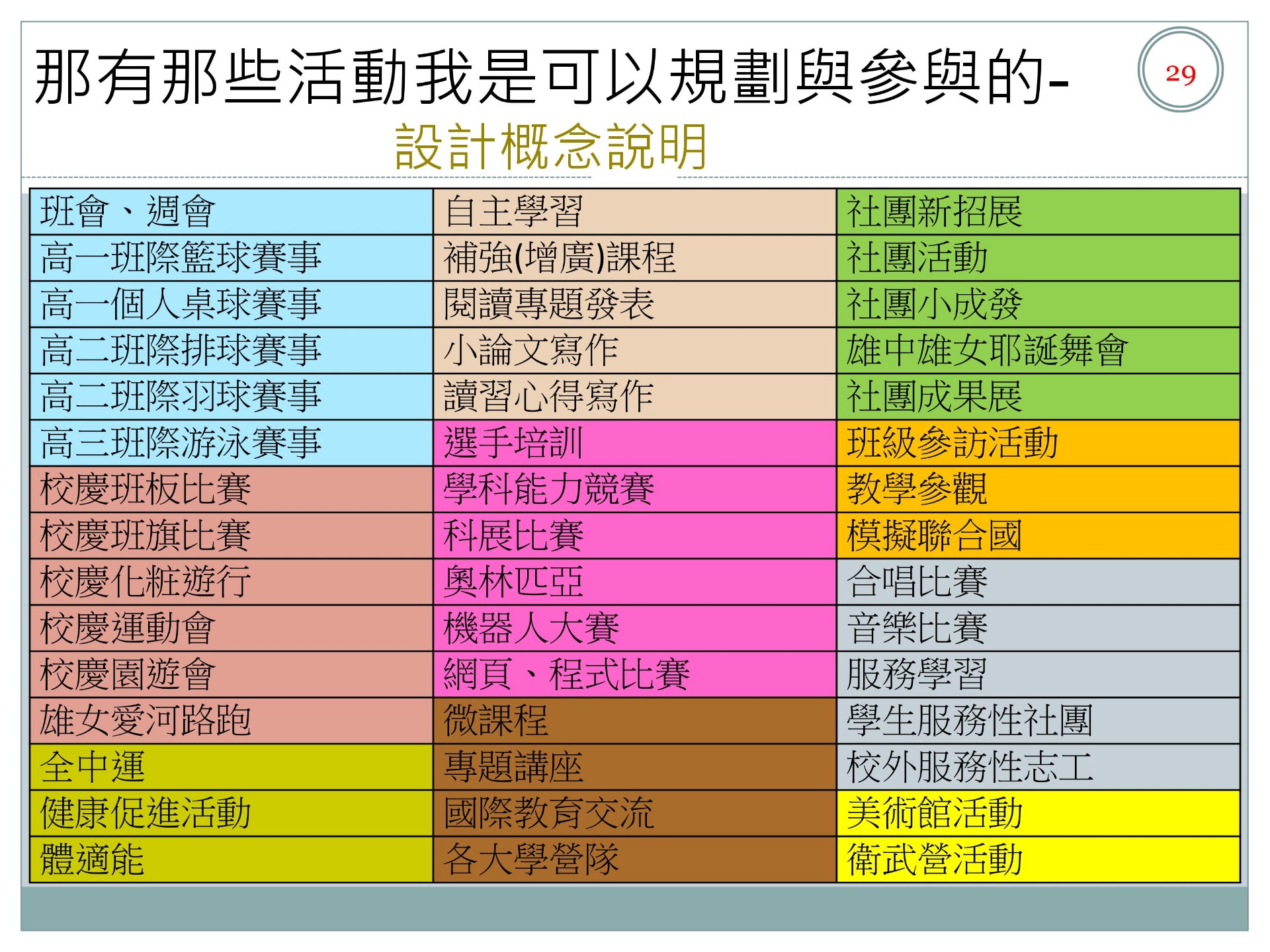 上面表格呈現雄女各項校內活動與自主學習內容。